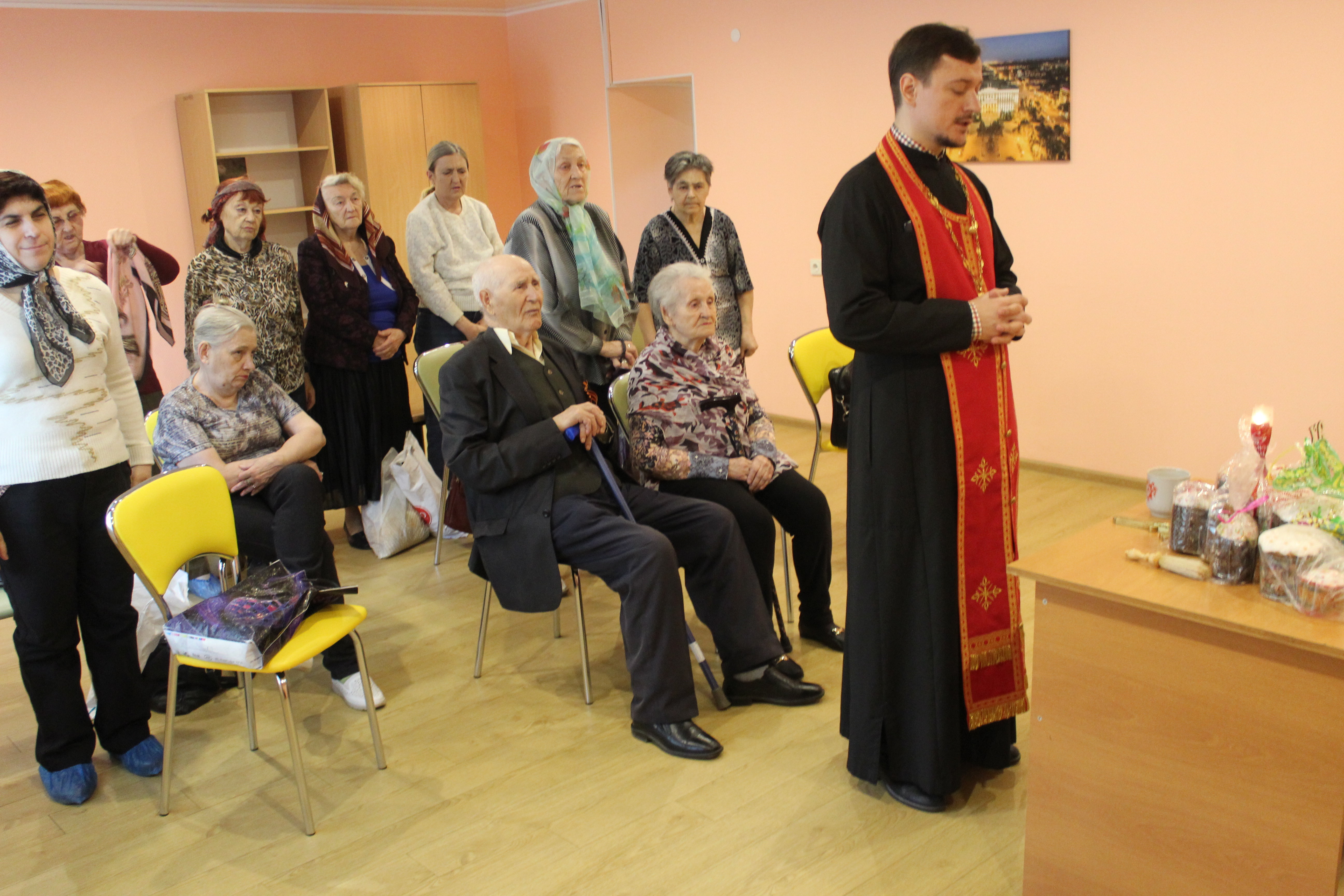 Ответив на вопросы, Отец Сергий прочёл пасхальный молебен и провёл ритуал окропления святой водой получателей социальных услуг и принесённой в дар пасхальной трапезы (яйца и паски).