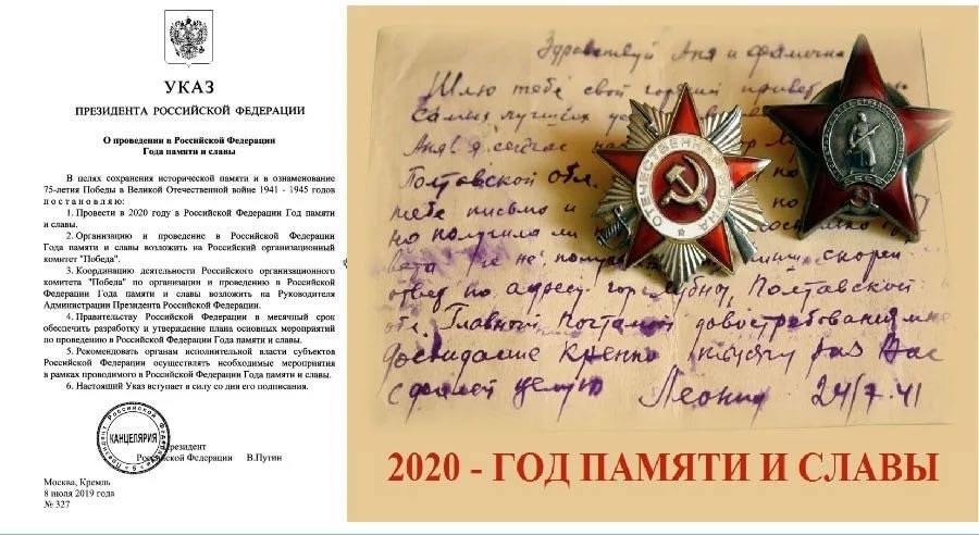 В целях сохранения исторической памяти и в ознаменование 75-летия Победы в Великой Отечественной войне 1941-1945 годов 2020 год Указом Президента России от 8 июля 2019 г. № 327 объявлен Годом памяти и славы.