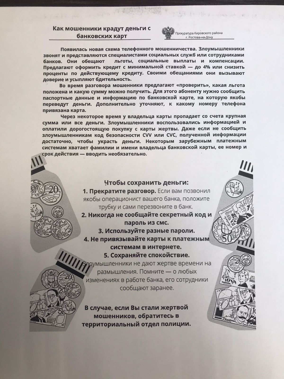 Социальными работниками в целях профилактики мошенничества среди пожилых граждан получателям социальных услуг ЦСОН розданы информационно-разъяснительные материалы, подготовленные прокуратурой Кировского района - Памятка «Как мошенники крадут деньги с банковских карт».