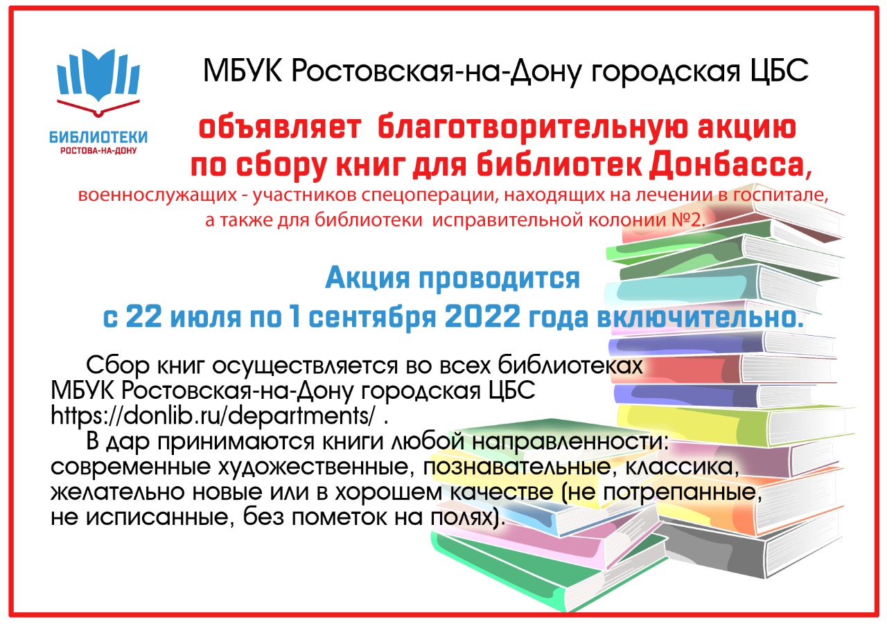 МБУК Ростовская-на-Дону городская ЦБС проводит благотворительную акцию по сбору книг для библиотек Донбасса, военнослужащих - участников спецоперации, находящих на лечении в госпитале, а также для библиотеки исправительной колонии №2.