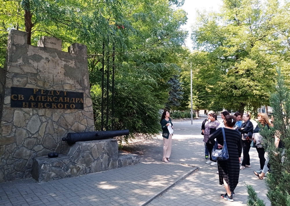 Далее сотрудники читального зала предложили посетителям мероприятия совершить экскурсию к скульптурному сооружению, которое символизирует редут Св. Александра Невского. Посетители увидели зубчатую стену, символизирующую защитные стены города, два герба, один из них самого Св. Александра Невского, и конечно же, пушку, как орудие, которое в те времена было самым востребованным и наиболее мощным.