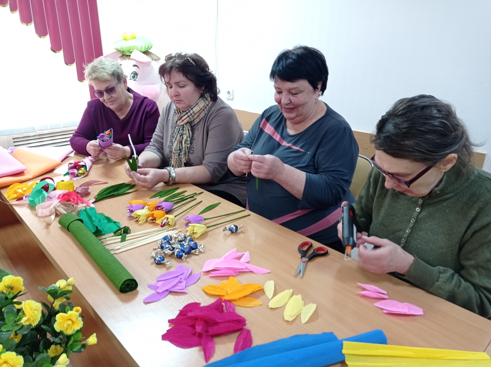 Получатели социальных услуг и сотрудники учреждения приготовили для людей с ограниченными возможностями букеты цветов из гофрированной бумаги с конфетой в бутоне.