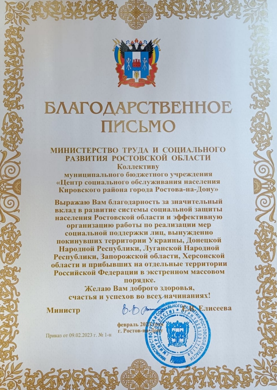 В письме выражена благодарность за значительный вклад в развитие системы социальной защиты населения Ростовской области и эффективную организацию работы по реализации мер социальной поддержки лиц, вынужденно покинувших территории Украины, ДНР, ЛНР, Запорожской области, Херсонской области, и прибывших на отдельные территории РФ в экстренном массовом порядке.