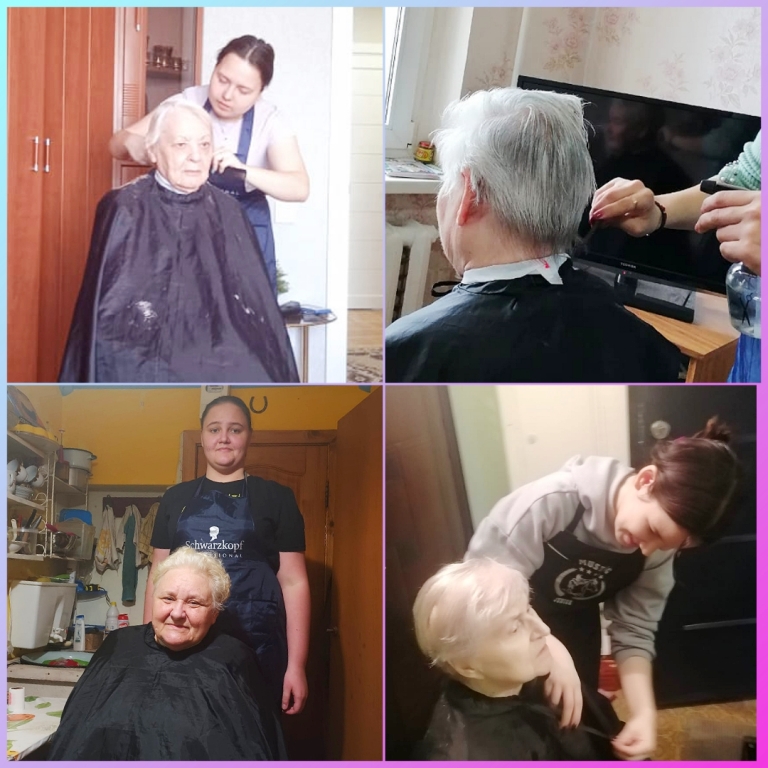 Будущие парикмахеры, устроив настоящие салоны красоты на дому у пенсионеров. Ребята очень внимательно подошли к получателям социальных услуг Центра. Выслушали все их пожелания и бесплатно сделали стрижки показав свои умения.