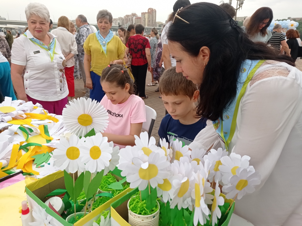 Сотрудники МБУ «ЦСОН Кировского района г. Ростова-на-Дону» предложили детям своими руками создать и подарить родным топиарии из ромашек - полевых цветов, символизирующих чистоту и мечты о любви и верности и головные уборы в виде ромашки.