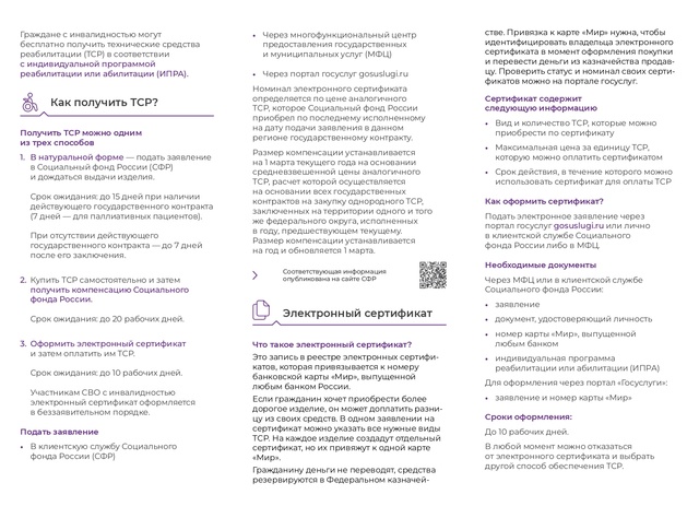 Подробности о получении технических средств реабилитации, электронном сертификате и каталоге ТСР читайте в карточках и на сайте sfr.gov.ru