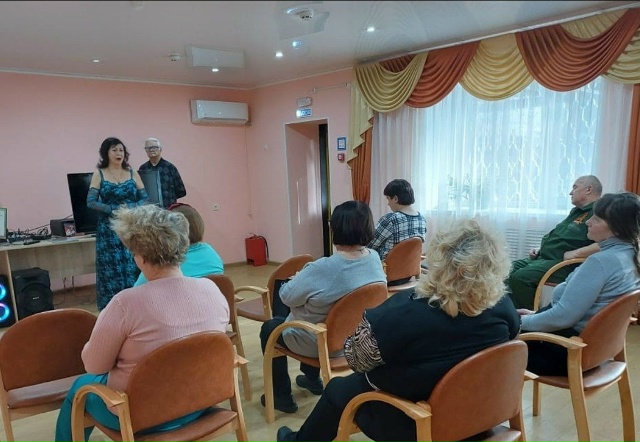 Получатели услуг слушали песни, которые исполнили коллективы "Фронтовые друзья" и "Коробейник".
