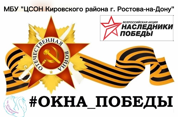 В канун празднования Дня Победы МБУ «ЦСОН Кировского района г. Ростова-на-Дону» принял участие во Всероссийской акции «Окна Победы». Выражаем огромную признательность и безграничную благодарность дорогим ветеранам, участникам Великой Отечественной войны 1941-1945 гг., подарившим нам мирное небо над головой! Наша память будет вечной! Помним, гордимся, чтим!