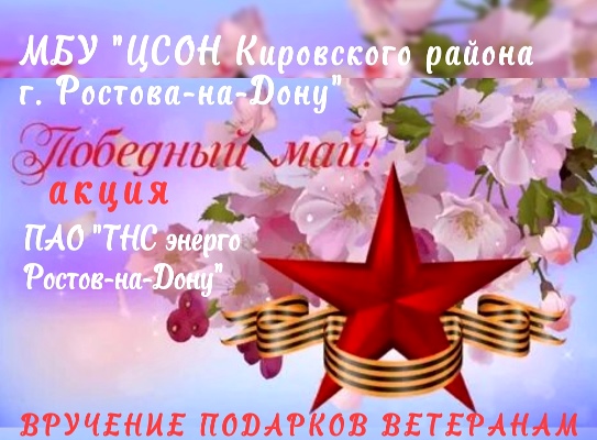 В преддверии праздника Победы в Великой Отечественной войне МБУ «ЦСОН Кировского района г. Ростова-на-Дону» совместно с ПАО «ТНС энерго Ростов-на-Дону» в рамках акции «Победный май» поздравили на дому ветеранов, вручив им подарочные наборы и цветы. Ветераны искренне благодарили за внимание и заботу, проявленные к ним. Поздравить ветеранов, выразить слова благодарности и признательности, за вклад, который они внесли в Великую Победу, это большая честь. Это лишь малая дань нашей благодарности за право сегодняшнего поколения жить под мирным небом.
