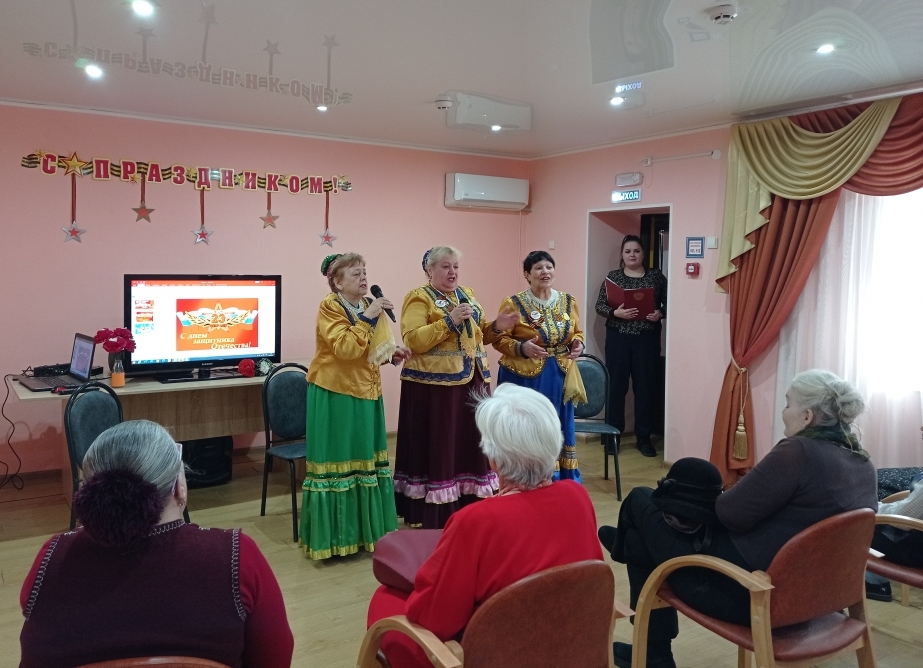 Праздничная программа была насыщенной и состояла из концертных номеров творческих коллективов и отдельных исполнителей. Серебряные волонтёры Центра, ансамбль народного творчества «Лазоревый цветок» порадовал зрителей своими задушевными и веселыми казачьими песнями. Квартет гитаристов «Домино» детской школы искусств им. А.П. Артамонова подарил получателям социальных услуг зажигательные мелодии. Также со сцены звучали стихи в исполнении воспитанников театрального кружка школы искусств. И, конечно, пришли поздравить наших доблестных мужчин несравненная Сидоренко Раиса Владимировна, серебряный волонтёр Центра, акапельно исполнившая патриотичные песни, и лауреат Международных конкурсов Стаценко Андрей Николаевич, подаривший зрителям «Балладу о дружбе» . Красочные номера позволили создать в зале атмосферу праздника и подарили массу незабываемых впечатлений!