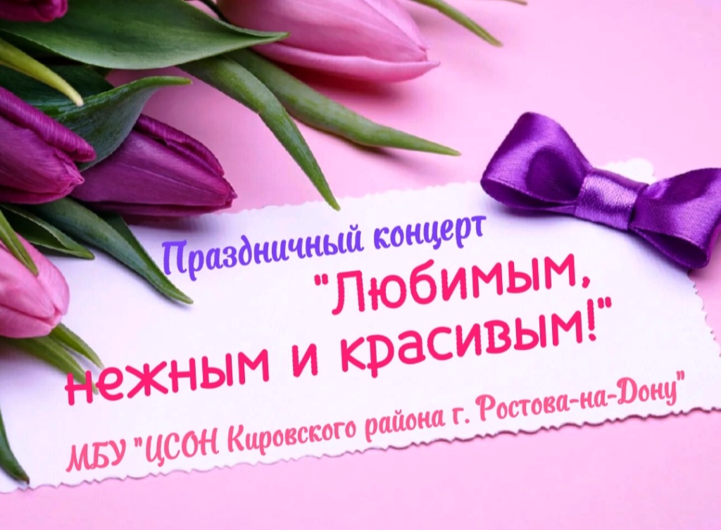 В преддверии праздника в МБУ «ЦСОН Кировского района г. Ростова-на-Дону» прошёл праздничный концерт «Любимым, нежным и красивым!», который был полон тёплых поздравлений, лирических стихов и песен, а также музыкальных видеопоздравлений. В программе мероприятия прозвучали песни о женщинах, любви и весне, в авторском исполнении Коробейникова Геннадия Евгеньевича, и стихи о прекрасной половине человечества в исполнении получателя социальных услуг Хановой Валентины Ильиничны. Также, всех присутствующих своими композициями порадовали серебряные волонтёры Центра – Сидоренко Раиса Владимировна и ансамбль народного творчества «Лазоревый цветок». Все присутствующие на концерте получили массу впечатлений и праздничное, весеннее настроение.