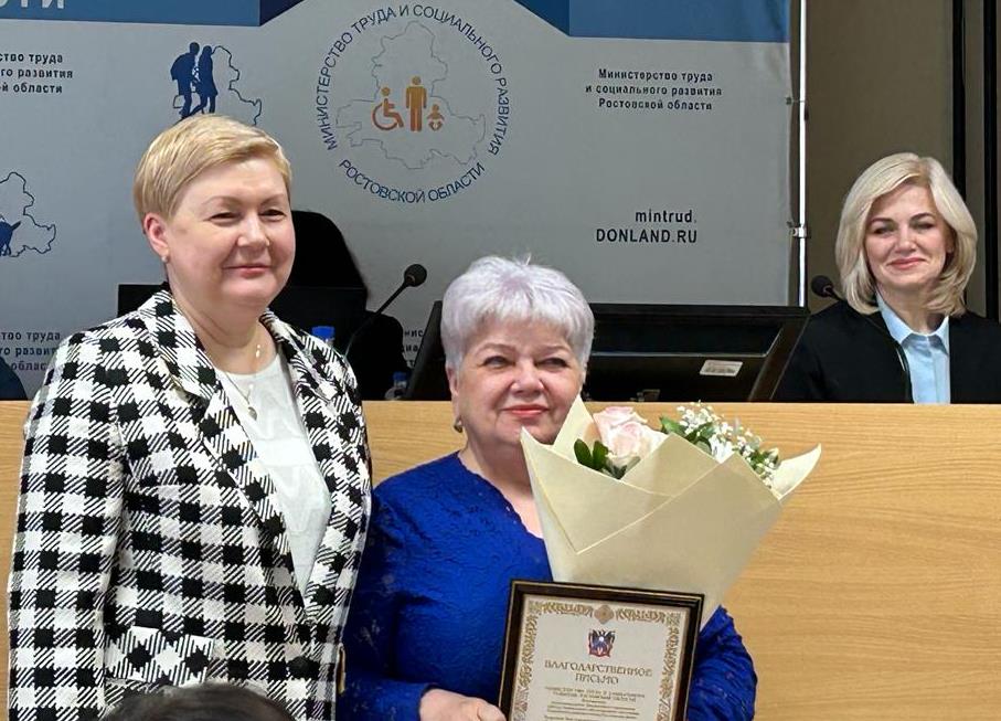 В письме выражена благодарность за значительный вклад в развитие системы социальной защиты населения Ростовской области и эффективную организацию работы по реализации мер социальной поддержки лиц, вынужденно покинувших территории Украины, ДНР, ЛНР, Запорожской области, Херсонской области, и прибывших на отдельные территории РФ в экстренном массовом порядке.