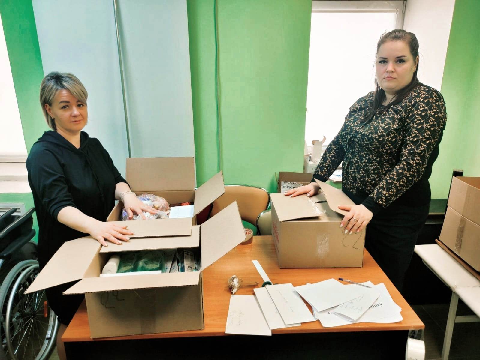 Собрали гуманитарную помощь в виде тёплой одежды для мирного населения. Спальные принадлежности, полотенца, медикаменты, бинты в госпиталь. Продукты, канцелярские предметы и средства гигиены для военных. В собранные коробки для солдат положили письма поддержки, которые написали получатели социальных услуг Центра.