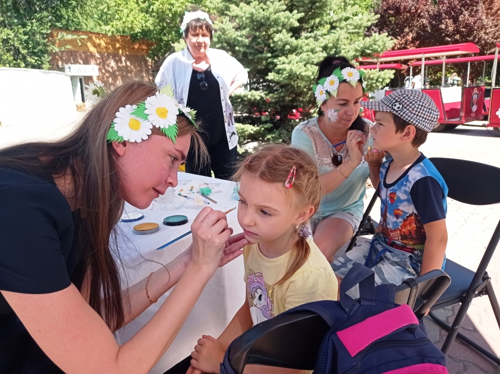 Порадовали детей аква-гримом, и на одной из аллей зоопарка рисовали с детьми цветными мелками.