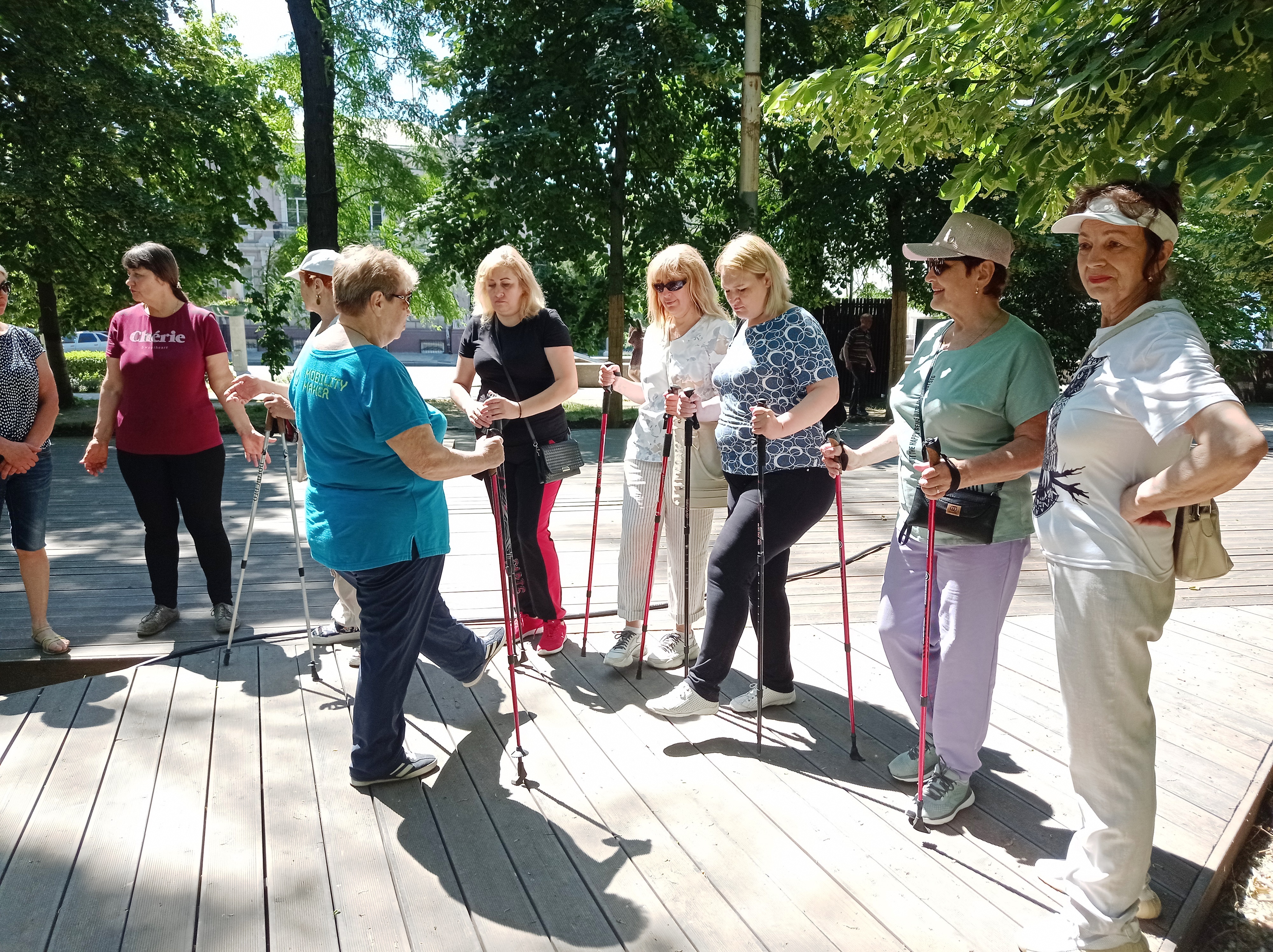 Занятия по скандинавской ходьбе проводит серебряный волонтёр Центра Валентина Михайловна Цацулина.