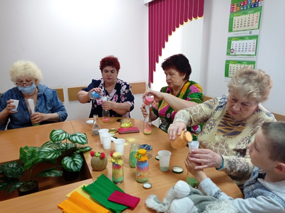 В ожидании этих дней в МБУ «ЦСОН Кировского района г. Ростова-на-Дону» серебряный волонтёр Валентина Михайловна Цацулина в творческих мастерских Центра «Радуга увлечений» провела для получателей социальных услуг мастер-класс по заполнению бутылочки окрашенной мелками солью - «Краски наступающего лета».