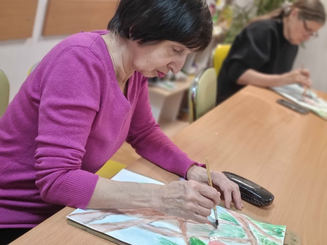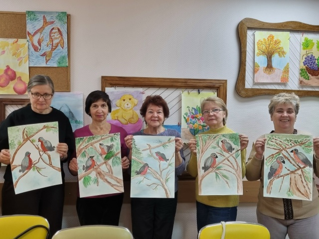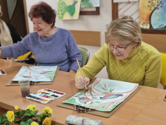 С получателями социальных услуг мы рисовали замечательных снегирей на ветках сосны!