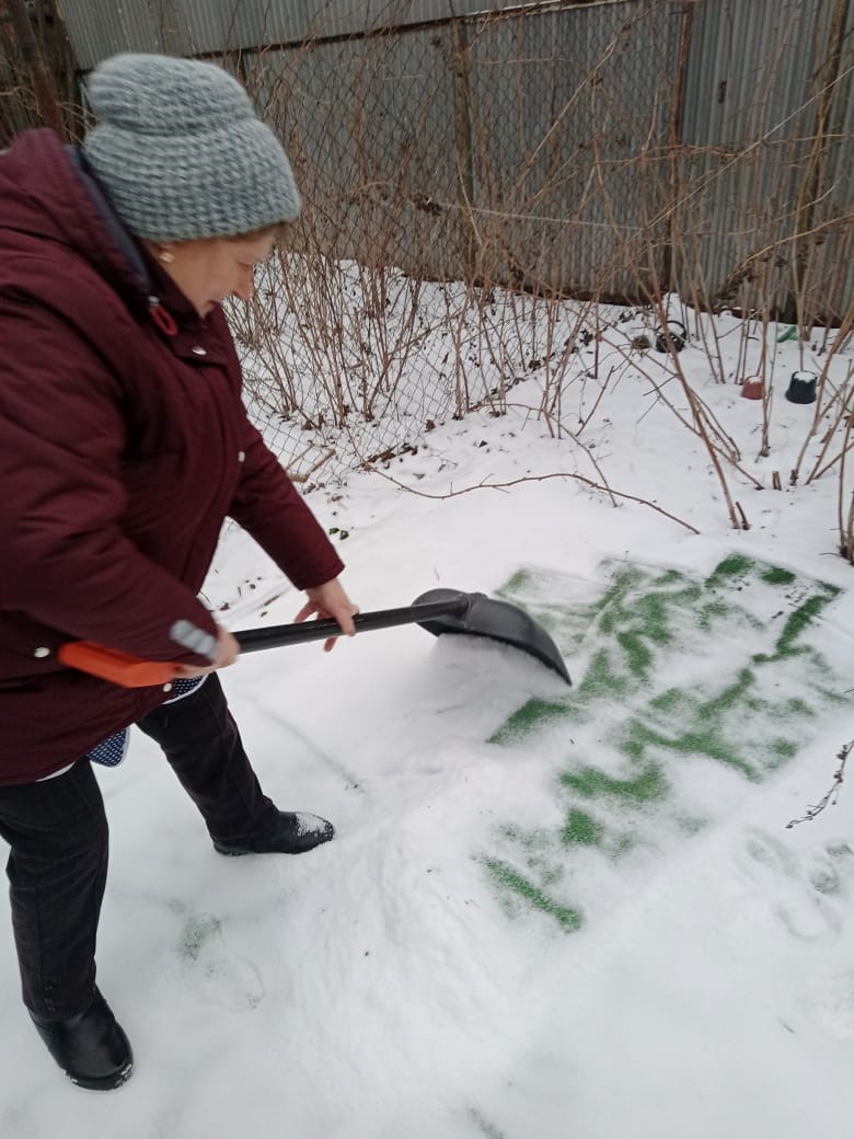 Так один и лучших социальных работников Центра Нина Федоровна Дробчак помогает получателю социальных услуг Гириной Надежде Егоровне почистить напольное покрытие на снегу.