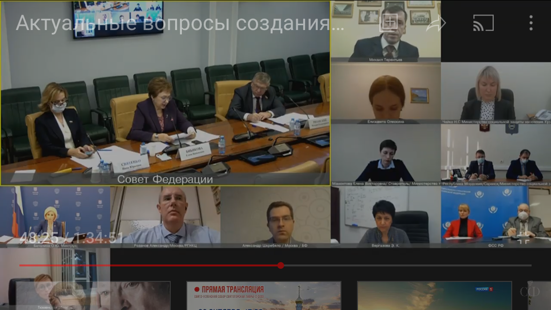 В Совете Федерации в формате видеотрансляции «в прямом эфире» под руководством зампреда Комитета СФ по социальной политике Елены Бибиковой прошел «круглый стол» на тему: «Актуальные вопросы создания сбалансированной системы социального обслуживания граждан. Внедрение и развитие системы долговременного ухода за гражданами пожилого по внедрению и развитию системы долговременного ухода за гражданами пожилого возраста и инвалидами».