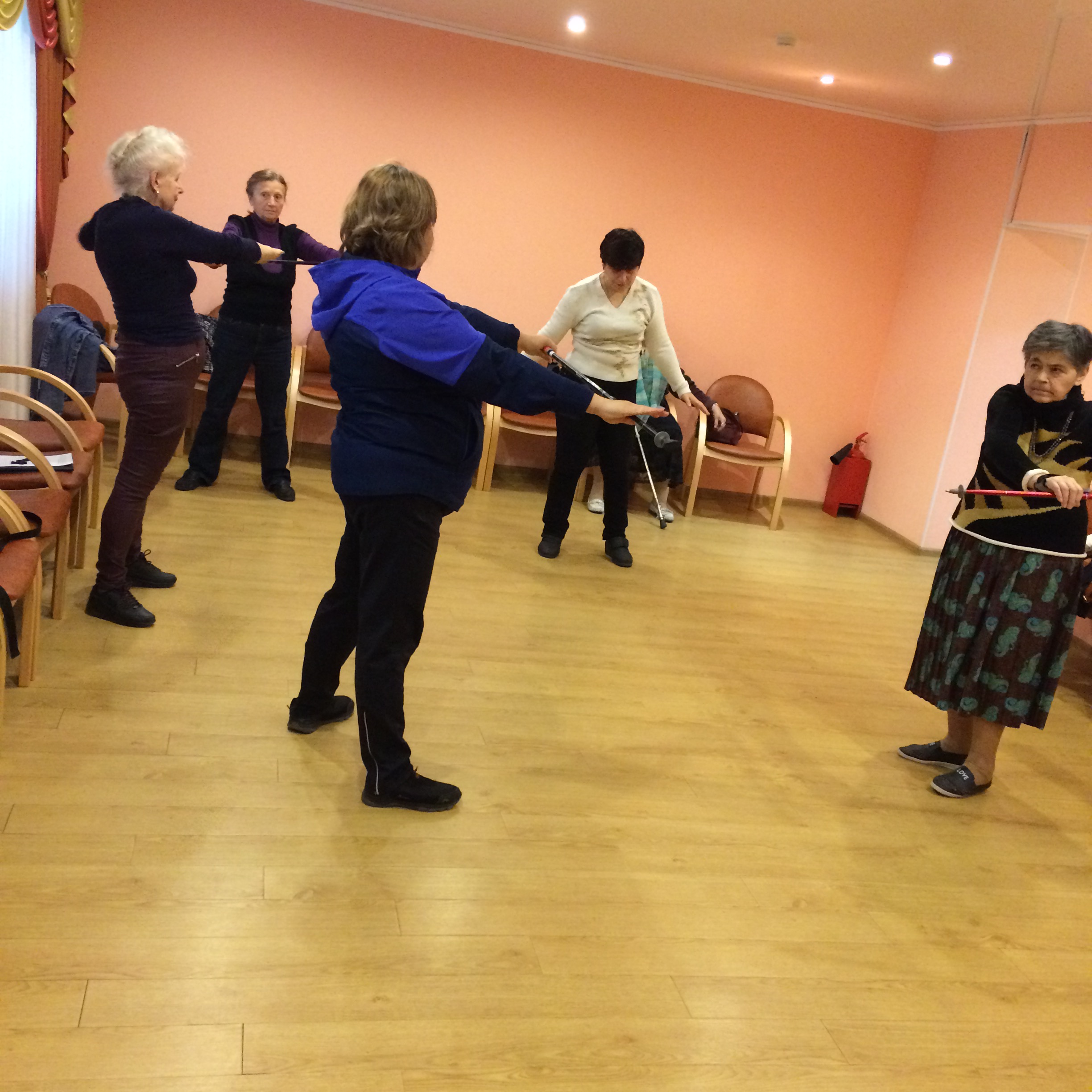 В конце мероприятия, получателям социальных услуг был предложен комплекс упражнений разминки, направленной на повышение функционального состояния, а также проработку суставов. Все упражнения выполнялись с скандинавскими палками, что было по силам абсолютно каждому из присутствующих! В ходе занятий инструктор рассказала и показала четыре подготовительных этапа перед ходьбой, включающие разминку, как правильно выставить рост палок, учетом роста человека и анатомических особенностей человека подбираются индивидуально и дополнительные детали к палкам (темляки, сапожки, наконечники) для каких целей они используются.