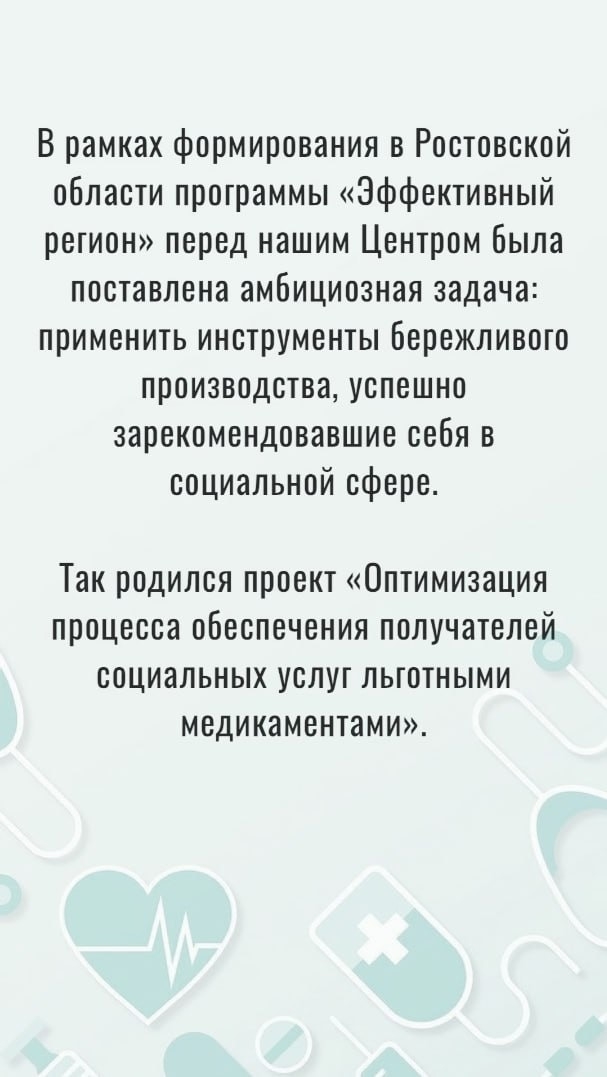 В рамках реализации проекта «Бережливая социальная работа» в МБУ «Центр социального обслуживания Кировского района города Ростова-на-Дону» (далее – Центр) внедрен проект «Оптимизация процесса обеспечения получателей социальных услуг льготными медикаментами» (далее – Проект). Задачи Проекта – оптимизация работы социальных работников для повышения качества их работы, увеличение общей удовлетворенности жителей района оказанными социальными услугами и сокращение издержек, потерь времени и ресурсов для работников сферы предоставления социальных услуг.